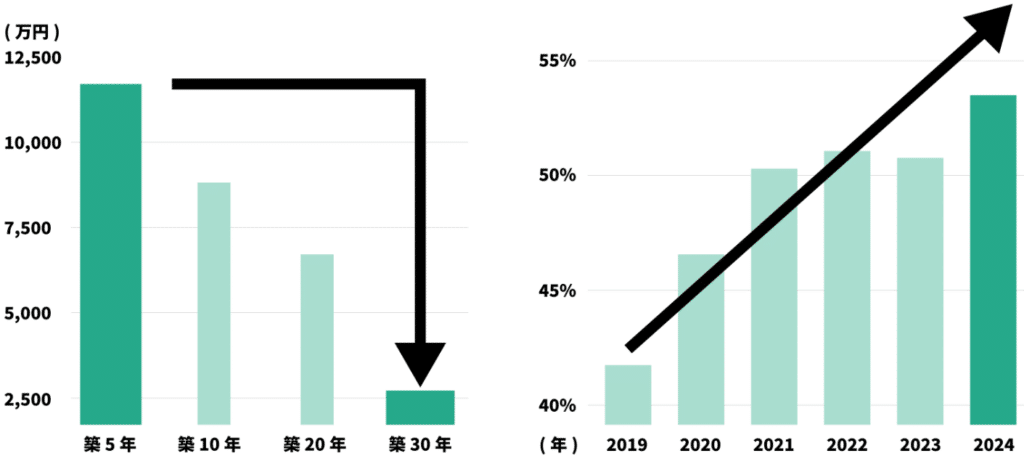 「中古マンションに住むならキレイな築浅物件にしたい」と考えがちですが、築5年と築30年の物件価格には約2倍もの差があります。さらに、中古物件の53.3%は築30年以上の物件であるというデータも。