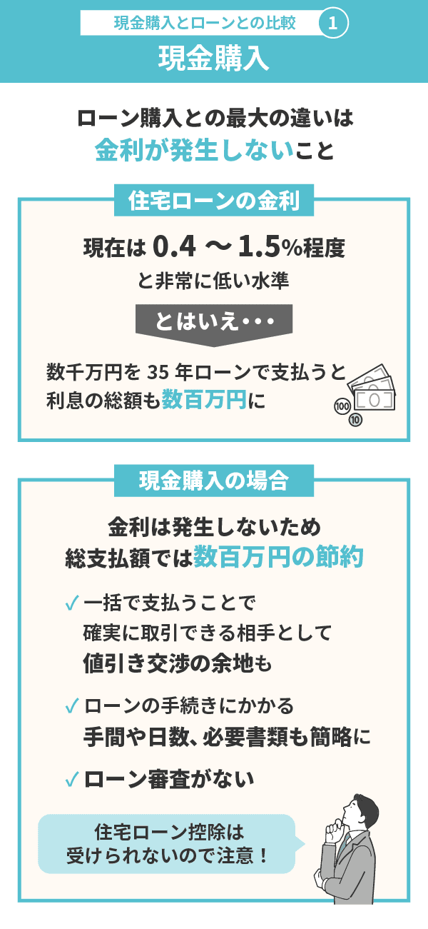 たしかにローン購入の場合、長年の積み重ねで金利が総支払額の少なくない割合を占めるため 、それを支払わなくて済む現金購入は魅力的に感じますよね。