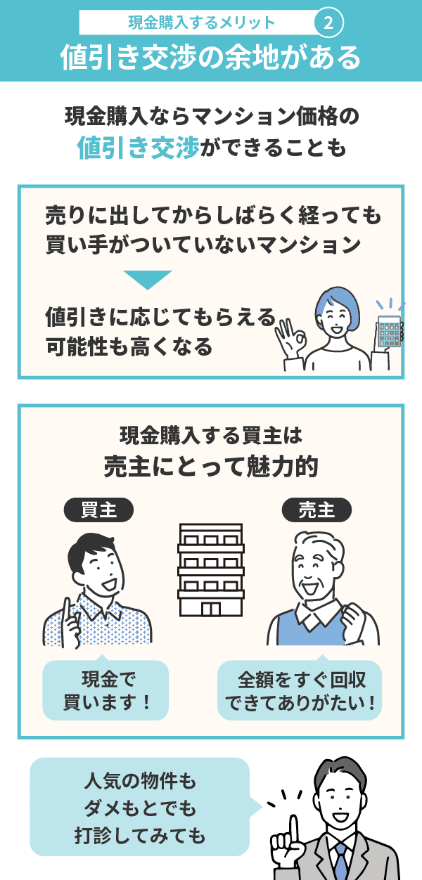 現金購入の場合は、マンション価格を値引きしてもらえるよう交渉することも可能です。