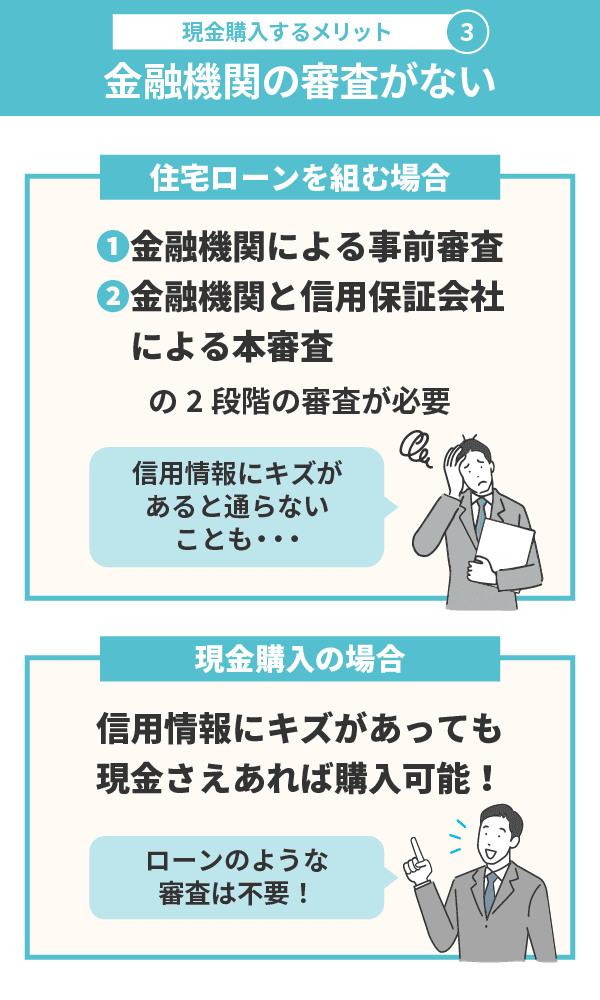対して現金購入は、過去にクレジットカードや携帯料金の支払い遅延があったり、自己破産したりなど、信用情報にキズがあってローンが組めない人でも、現金さえ用意できればマンションを購入できるのが利点でもあります。