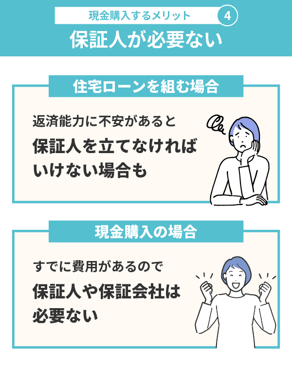 対する現金購入の場合は、購入額をすでに用意できているわけですから、保証人を探したり保証会社と契約したりする必要はありません