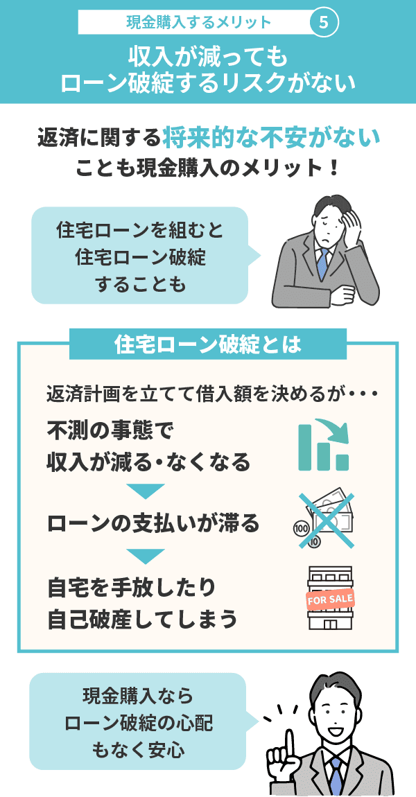 もしそうなってもマンションを現金購入していれば、少なくとも自宅を手放すリスクからは免れます。住宅ローン破綻の心配とは無縁でいられるという安心感は大きなメリットと言えるでしょう。