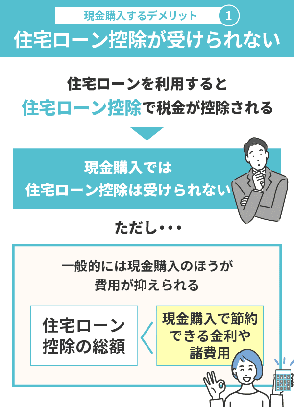 一方で、現金購入では最初に購入金額を全額支払ってしまうので、毎年税金が控除される住宅ローン控除は受けられません。