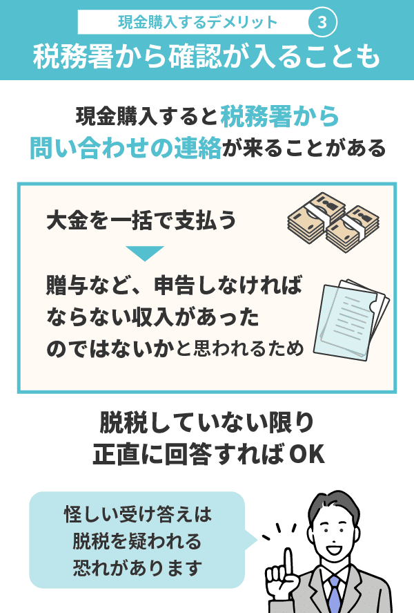 その他、多額の現金を支払ったことで、税務署から調査が入る可能性もあります。
