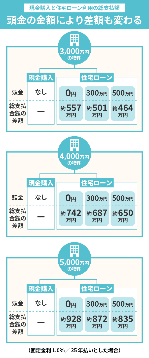 一方、現金購入の場合は金利は発生せず、総支払額でいえば数百万円の節約になります。数千万円の現金を現金で支払うことで、売主にとってもっとも確実に取引できる相手と判断してもらえるため、値引き交渉の余地も生まれるでしょう。