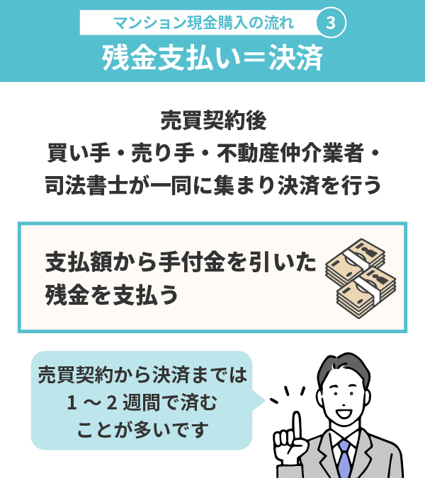 売買契約から決済までは、1~2週間で済むことが多いようです。住宅ローンの場合は早くて1~2か月はかかるので、現金購入の場合は手続きがスムーズだといえます。
