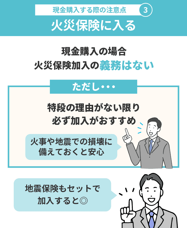 一方で、現金購入の場合には火災保険に加入する義務はありません。