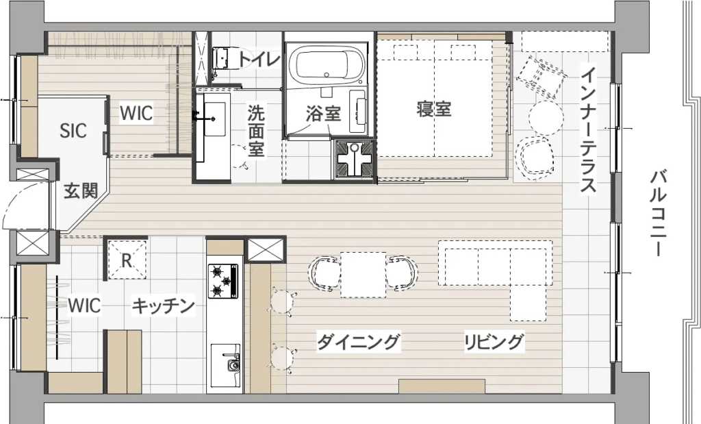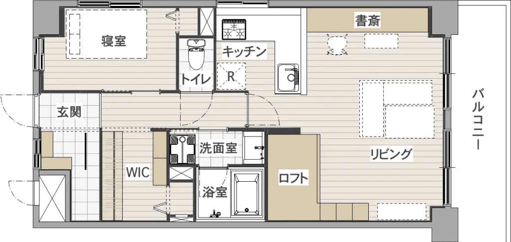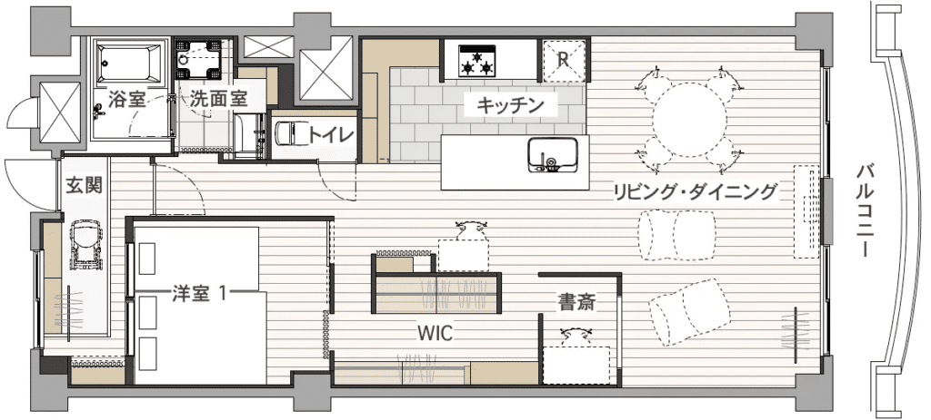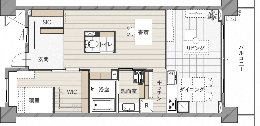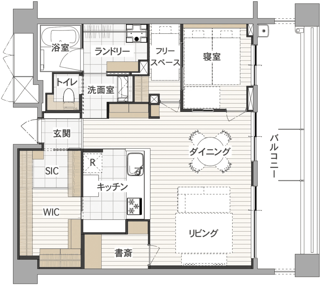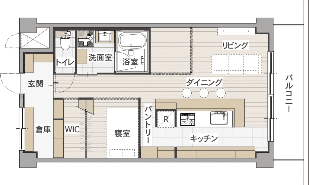 谷川例えば、玄関→シューズクローク→リビングと通り抜けられる間取りにすると、コートやバッグをしまってから室内に入れるため、玄関やリビングが散らかりにくくなります。