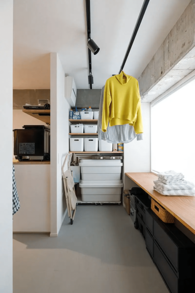 サニタリーと隣接するパントリーにアイアンバーを取り付けたことで、洗濯動線を簡略化しています。