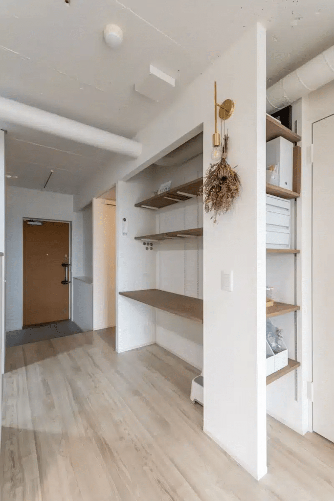 玄関の壁面に棚を設置して収納を確保するタイプです。