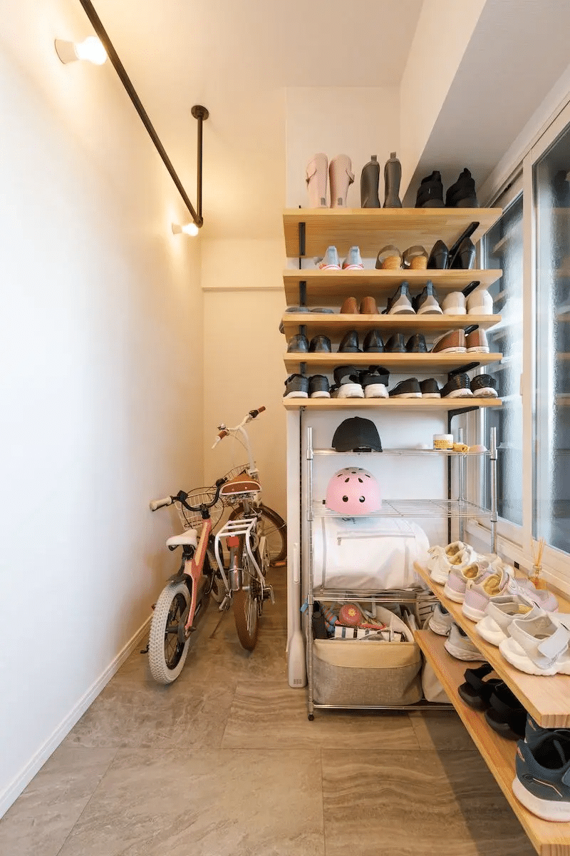 リノベーションをする前に配置されていた、玄関側の洋室を取り払ってWICとSICにした間取り。自転車を置ける広さを確保し、外出と帰宅後の動線に配慮しています。壁付けにしたラックには、シューズはもちろんのこと、自転車用のヘルメットや外遊びグッズもすっきり収納されています。