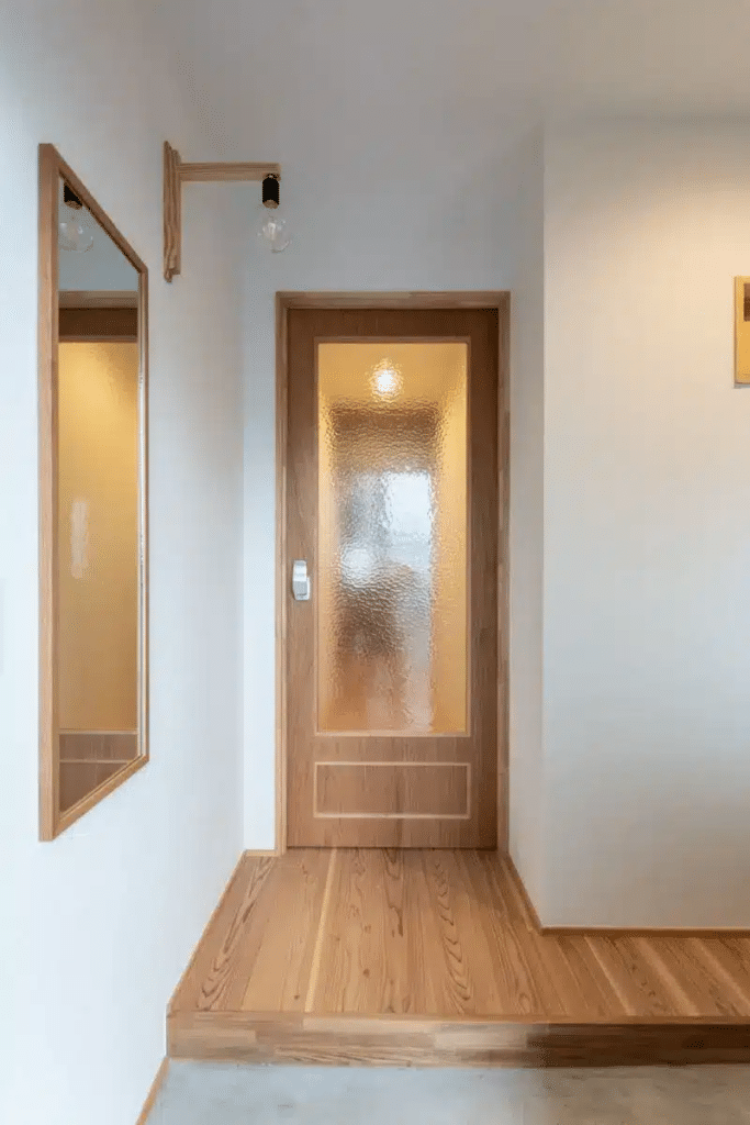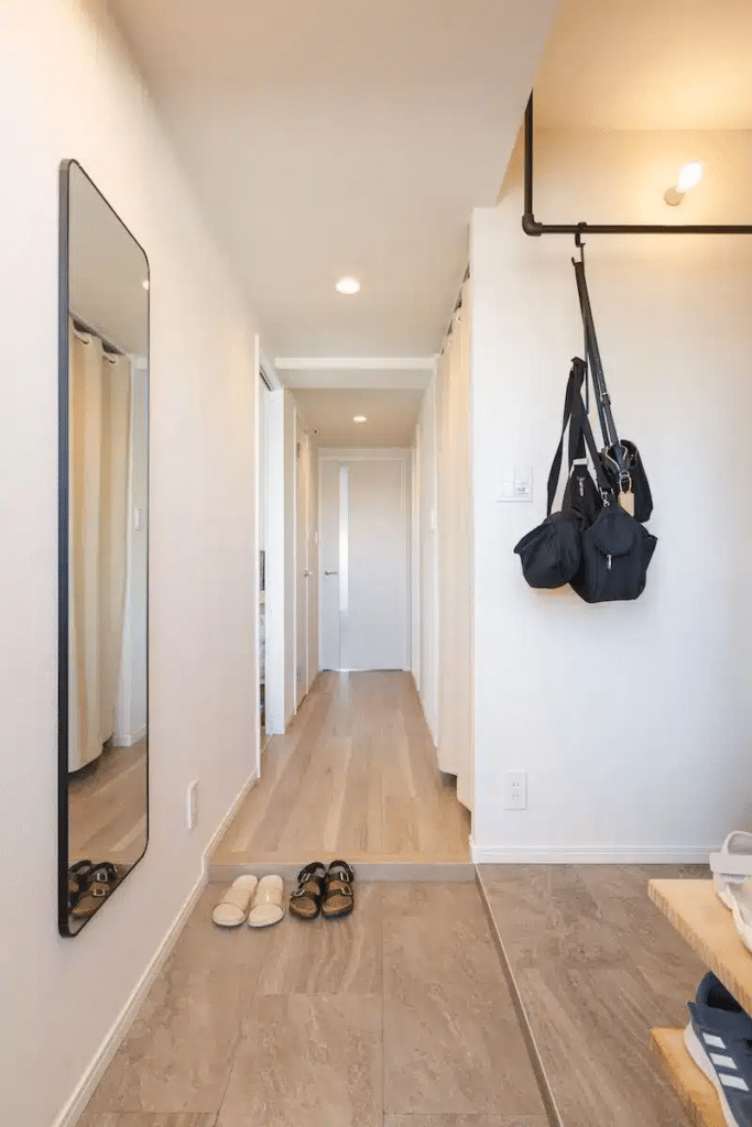 玄関前のミラーは、お出かけ前のコーディネートチェックにも役立ちそうです。