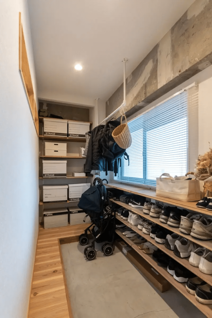 靴収納が中心なら棚を多く設ければコンパクトなスペースでも十分ですが、ベビーカーやアウトドア用品、子どもの遊び道具なども収納する場合は、奥行きや可動棚などを考慮した設計が必要です。
