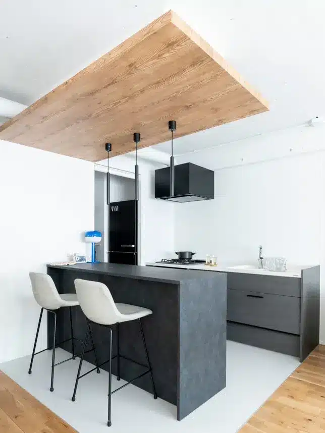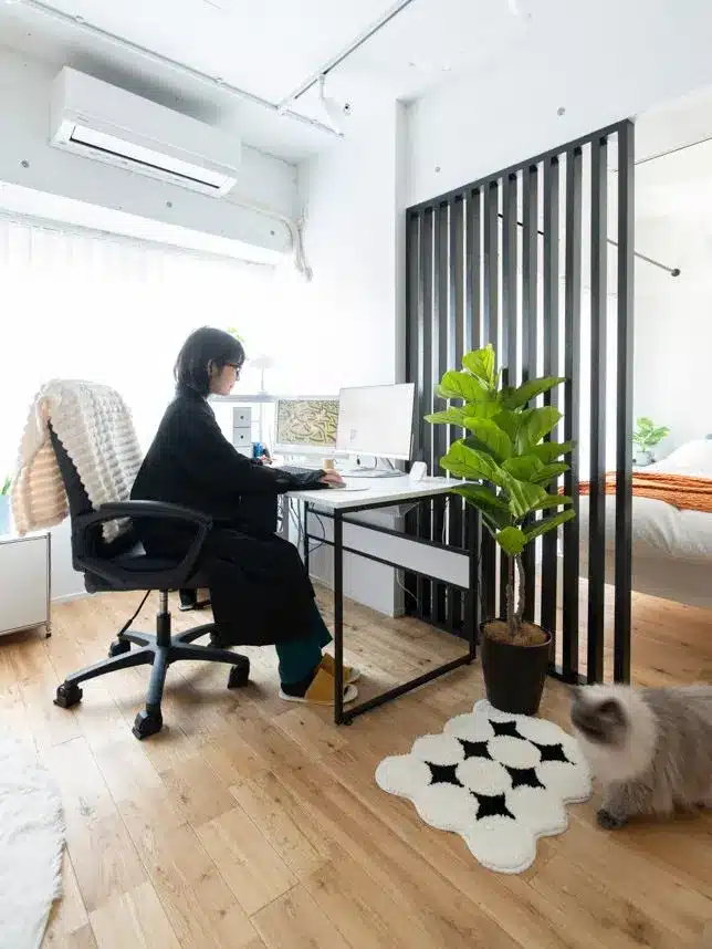 おうち時間の多くをPC作業に充てている施主様のための、ワークスペースを中心としたプラン。効率的なワンルームは、自由気ままに歩き回る猫ちゃんとの暮らしにもぴったり。キッチンの下がり天井や黒がアクセントのシンプルモダンな内装が、ビビッドな色の家具を引き立てます。