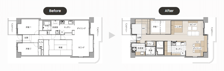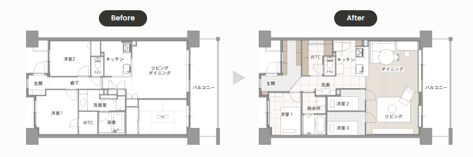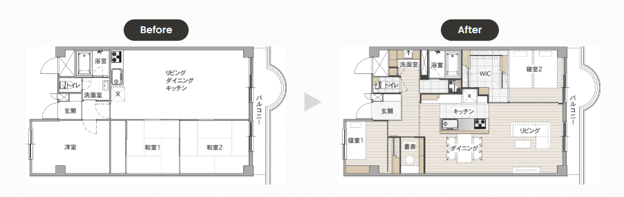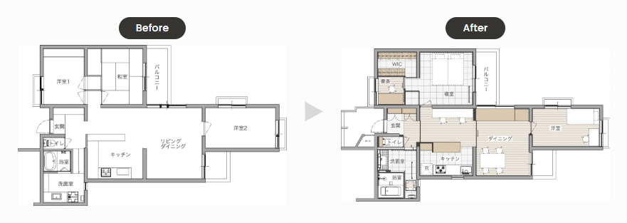 つまり「将来的には子供部屋に3LDKが理想だが、夫婦二人のうちは広々とした2LDKもいいな」「各部屋からアクセスしやすいWICが欲しい」といったお悩みをリノベーションによりまるっと解決できるのです!
