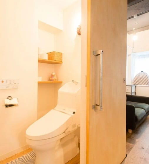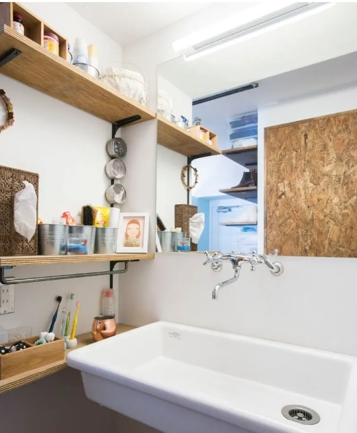 洗面台の横や上部にオープン棚を設ければ、使いたいものを手に取りやすく、空間を広く見せることができます。トイレの背面や側面に浅めの造作棚を設置することで、限られたスペースでも収納とディスプレイを両立することができます。