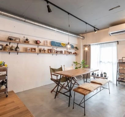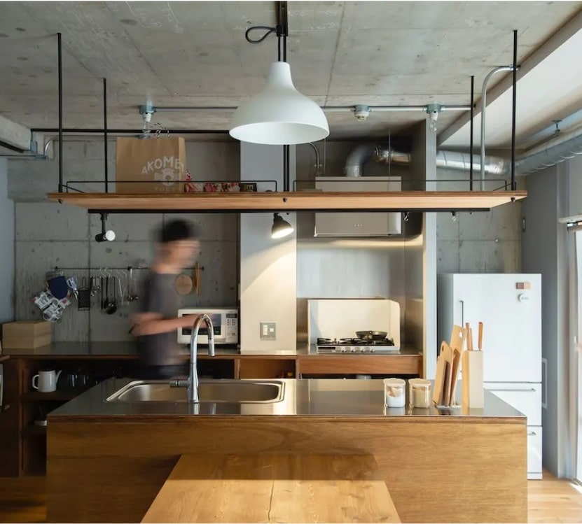ウッド調アイテムとモルタルやタイルで温かみとインダストリアルな雰囲気を演出したリノベーション。限られた平米数を最大限に活用するために試行錯誤し、最終的に効率的な間取りを実現。寝室もパイプスペースの制約を克服し、広々とした空間を確保しました。