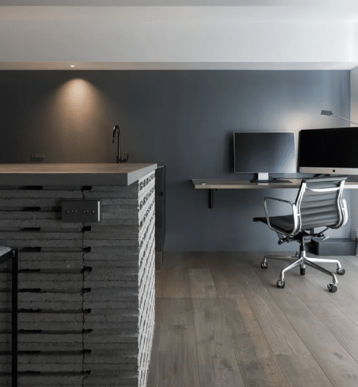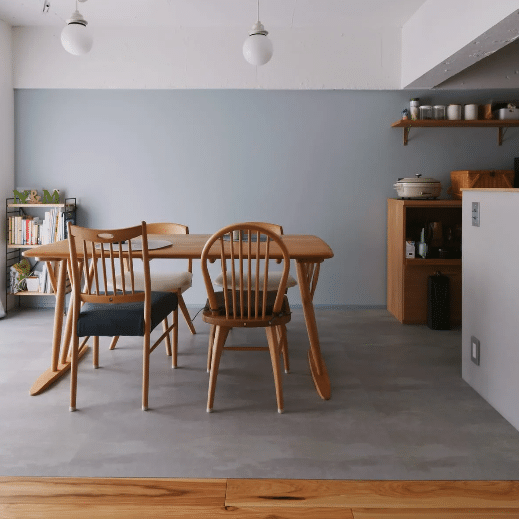コンクリート調の淡いグレーの壁で洗練された空間を演出
