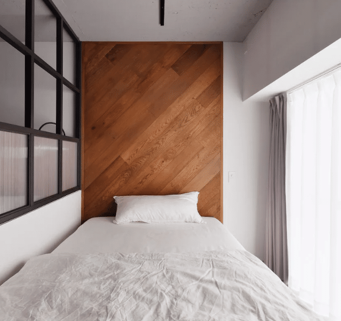 すべての壁をかえなくても、ベッドヘッド側だけの壁紙変更で十分印象が変わります。
