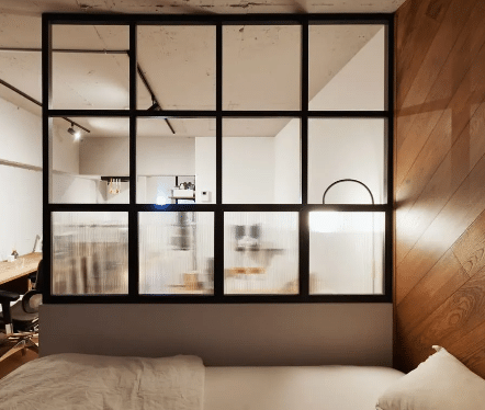 必要以上に壁をつくらないことで光と風がめぐる広いLDKを確保しました。床はナチュラルで上品な風合いのヒッコリー材をセレクトし、部屋ごとに濃淡をつけたこだわりの壁は部分的にDIYにすることでコストカットも実現。寝室は圧迫感を軽減させるためガラス窓を造作しました。