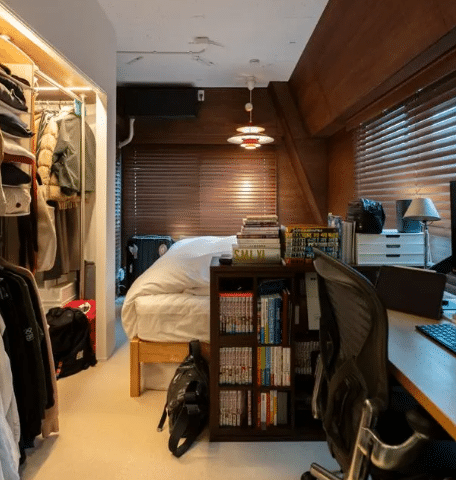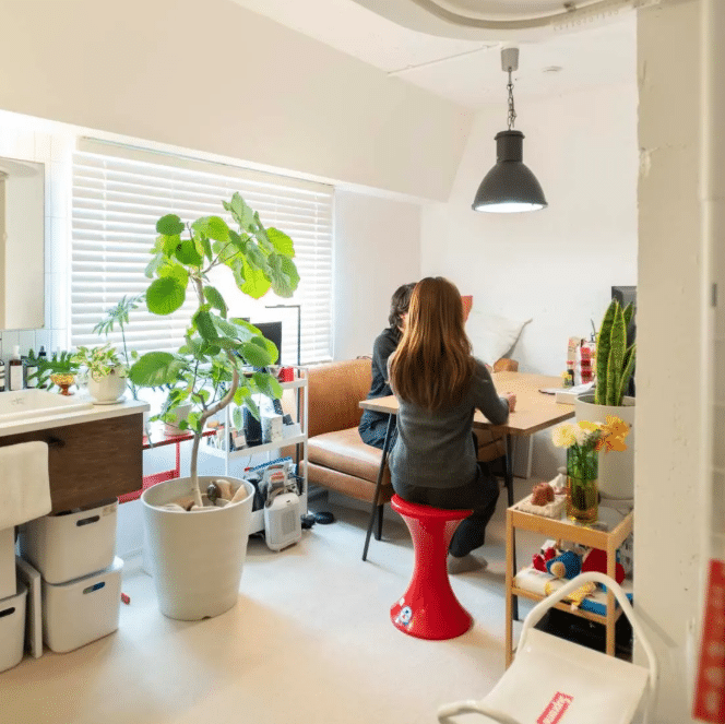 お部屋の中心にある箱が生み出す、ぐるぐる回れる回遊動線。趣味のアイテムをまとめて収納したり飾ったりできて、さらに子どもが部屋中を走り回れるとは、なんと懐深いワンルームなのでしょう。リノベらしい異素材や色の組み合わせで、ミッドセンチュリーな空間が完成しました。