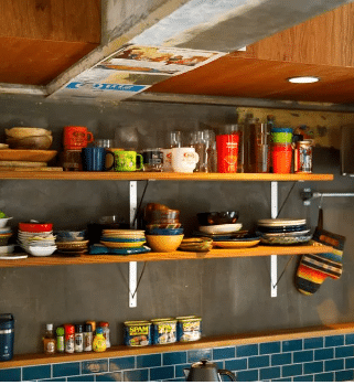 異素材を組み合わせたキッチンまわり。タイルやモルタル、木の質感に加え、ディスプレイされたアイテムが空間にリズムを生み出しています。