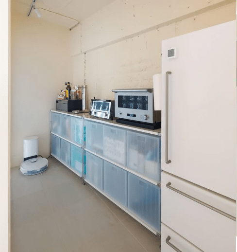 半透明の収納や異素材を組み合わせた、すっきりとしたキッチン空間。