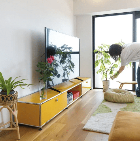 異素材のマスタードイエローのTVボードとグリーンが映える空間
