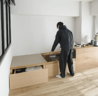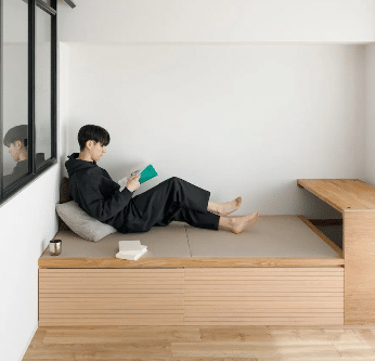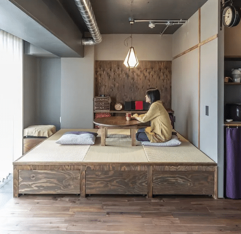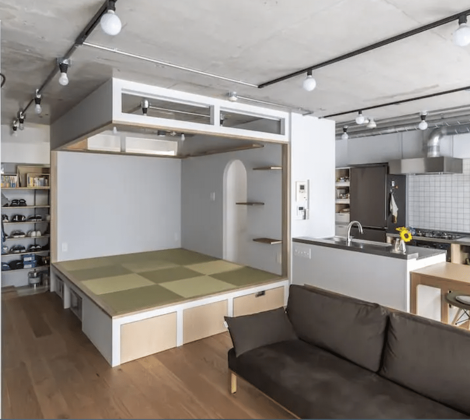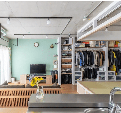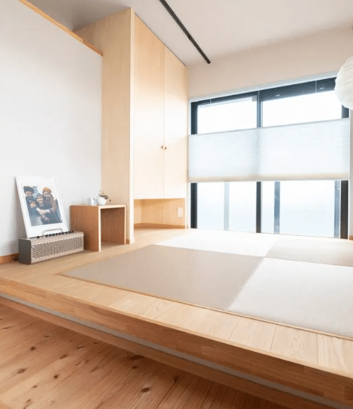 限られた空間の中で、小上がりの畳スペースを取り入れることで、くつろぎの場と生活空間を心地よく分けた住まい。コンパクトでありながらも、素材や配置の工夫によって、落ち着きのある和モダンの空間に整えられています。