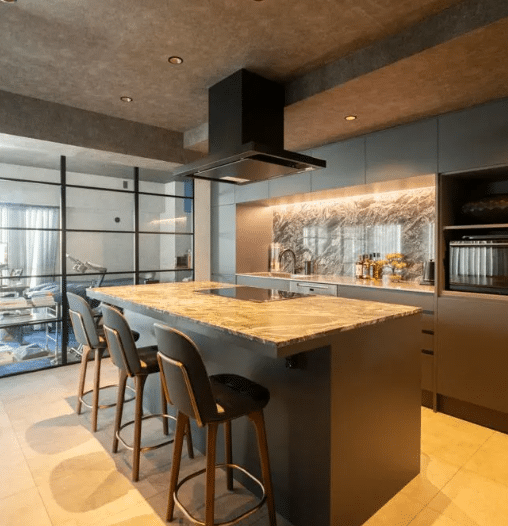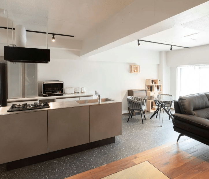 “人が集える場所”をコンセプトにした一人暮らし男性のお住まい。グレートーンで統一したお部屋は、ホテルやバーのように落ち着く空間です。来客に配慮した設計でゲストはもちろん、住まい手にとっても居心地のよいお部屋が実現しました。アートのような美しい天然石やタイルが気分を高めてくれます。