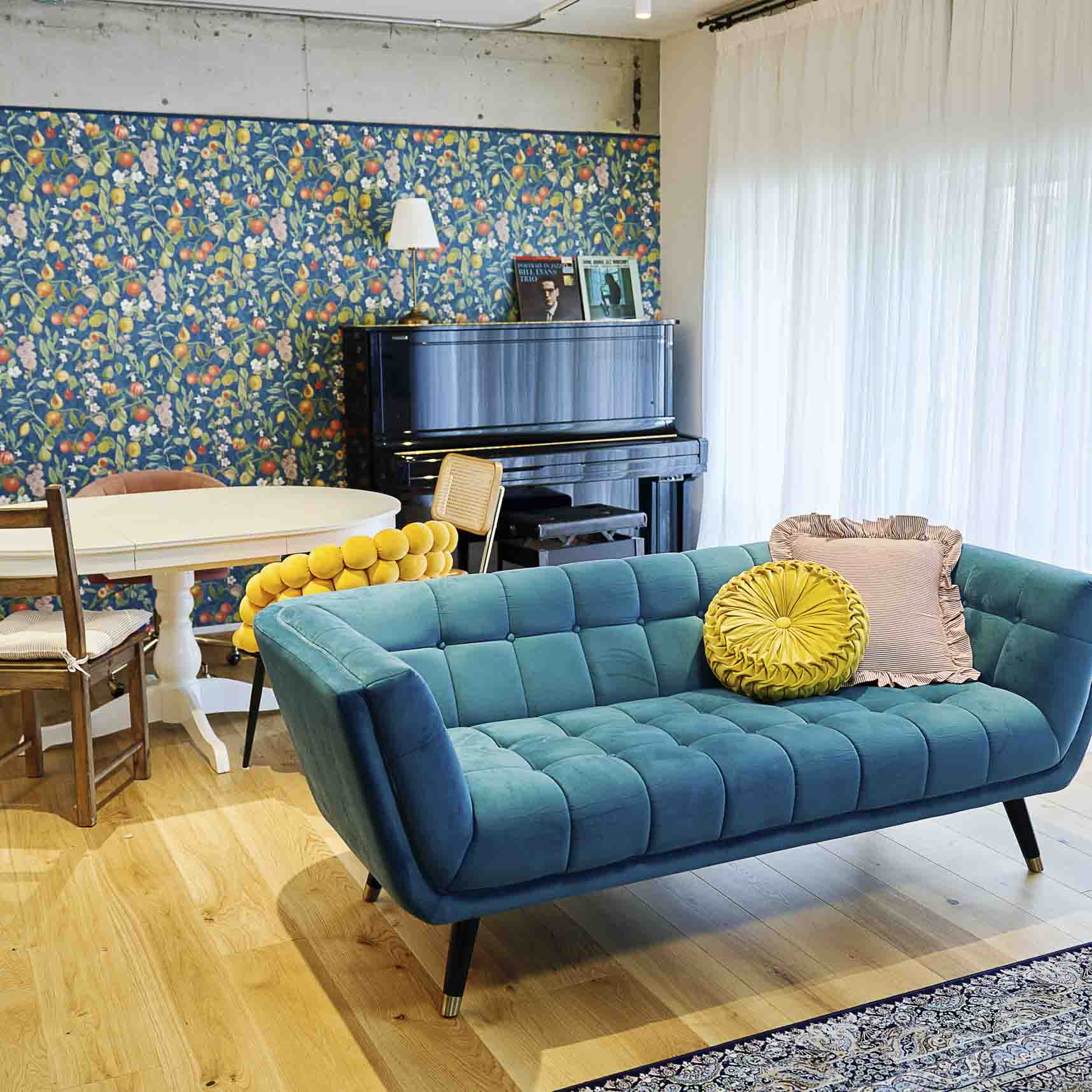 北欧系テキスタイルメーカーとのコラボ壁紙は、ファブリックのような温かみがあり、リビングやダイニングのアクセントにもよく使われています。