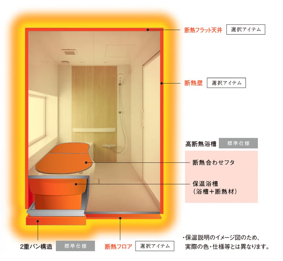 高断熱浴槽に加え、安心の2重パン構造で浴槽内の湯温低下を抑えます。