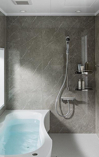 腰壁部分や床・壁の質感やデザインが和を感じさせる、癒やしのバスルーム。日常にちょっとの特別感が入り交じった、リラックス空間に仕上がっています。
