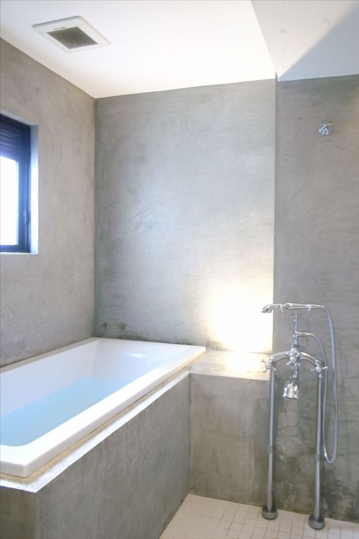 ユニットバスの部品なども使わず、すべて在来工法で造作しているバスルームは、タイル張りとモルタル仕上げでスタイリッシュな印象に。