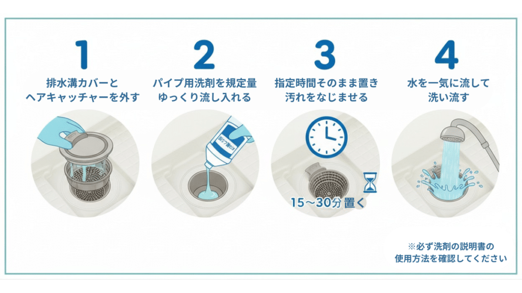 ヘアキャッチャーを掃除しても流れの悪さが残る場合は、排水トラップの内側や排水管の入り口付近に汚れが溜まっている可能性があります。「目に見えない部分」の軽い詰まりには、パイプ用洗剤を使って内部の髪の毛やヘドロを溶かす方法が有効です。