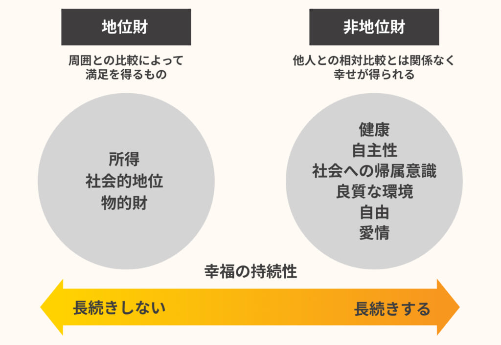 まさにそのイメージです。幸せに影響する財を大別すると “地位財” と “非地位財” に分かれます。前者はポジショナルグッズの和訳で「人と比べて満足感を得られる財」という意味。経済学者のロバート・H・フランク先生がつけたネーミングで、お金と物と地位を指します。