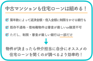 とはいえ、こうした制限が起きるのはあくまで一部の場合です。より詳しく知りたい方は、中古マンションの住宅ローンについて説明しているこちらの記事をご覧ください。