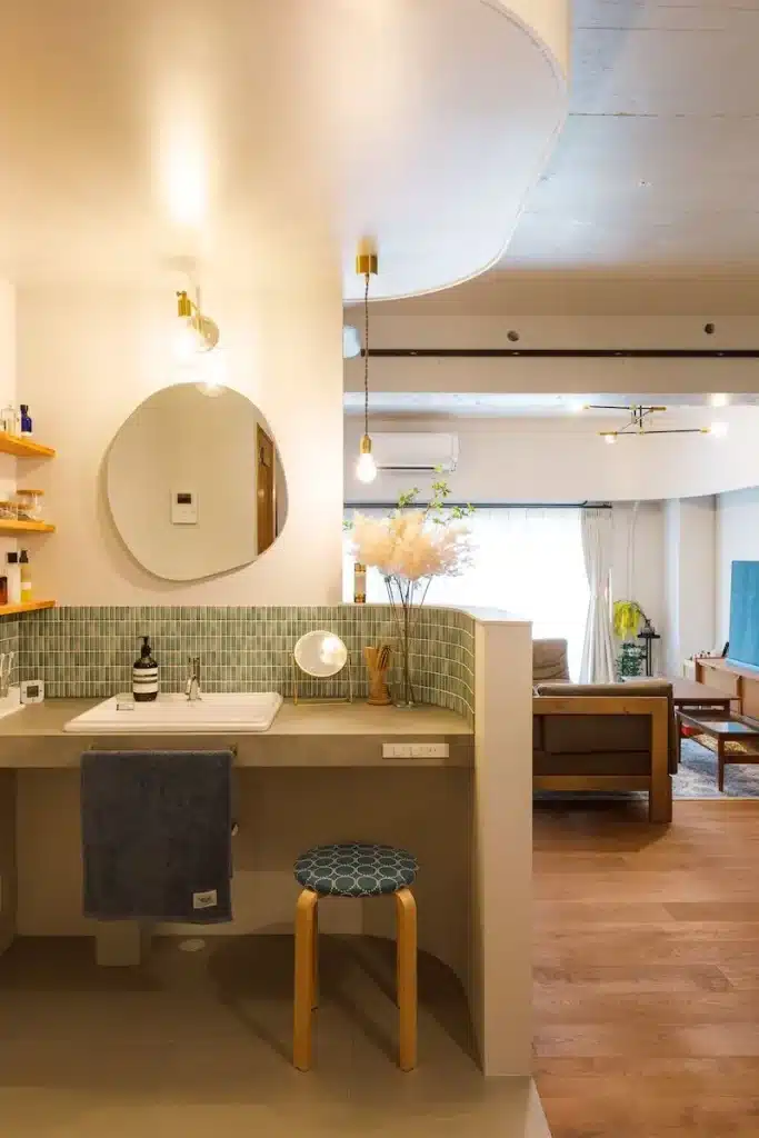 奥さまの「太陽光の元でメイクがしたい」というご希望を叶えるため、洗面化粧台をリビングの一角に配置しました。お部屋のあちらこちらに「まるみ」を大切にしたデザインを施しているため洗面台の腰壁もRで可愛く仕上げています。白を基調にしたトーンにブルーのモザイクタイルが印象的です。