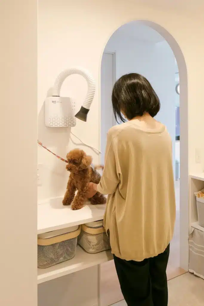 とにかく愛犬ファーストですべてのデザインをとのご依頼に様々な形で応えました。洗面台もその一つで、愛犬をシャワーした後すぐに乾かせるグルーミングスペースを設置しています。グルーミングスペースは立ったまま使用できるように高さを設定しているので飼い主様の足腰にも優しい設計です。