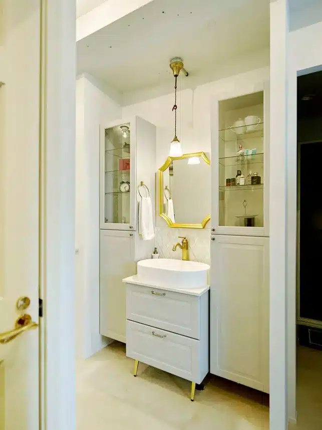 白を基調に、黒・ゴールドの小物で空間にスパイスを。カラフルなインテリアを散りばめたパリのアパルトマン風リノベに、親族から継承した家具が息づきます。広いリビングには自然と家族が集まり、ダイニングに面したキッチンや洗面台は、子どもたちとの会話を弾ませます。