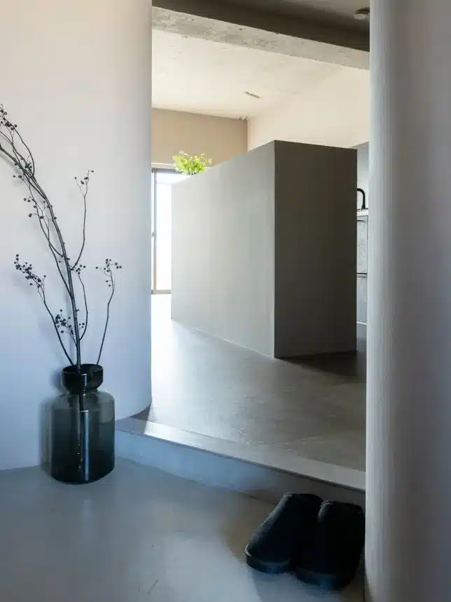 しっとり落ち着いた大人なトーンの内装に、曲線を多用して柔らかさを演出したワンルーム。家ではゆったりくつろぎたいという施主様の気持ちを叶え、収納・動線もばっちり。植物たちがモノトーン空間を彩る、コンパクトながらもたくさんの表情を見せてくれるお部屋です。