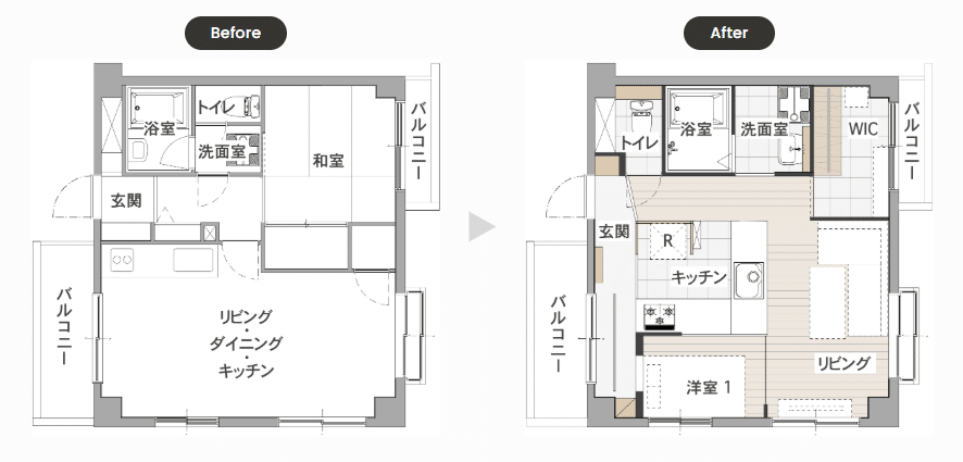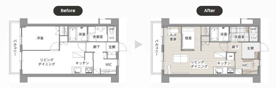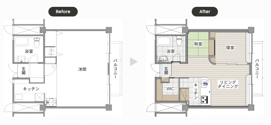 リノベーションによっては元の間取りをすべて変えて理想の間取りを叶えたり、壁や床も塗り替え・張り替えを行って空間のイメージを一新したりと希望を最大限に叶えることができます。