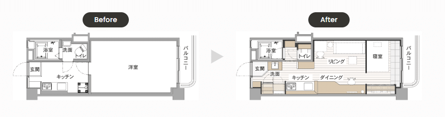 こちらは37㎡の2LDKをゆったり1LDKにリノベーションした事例です。