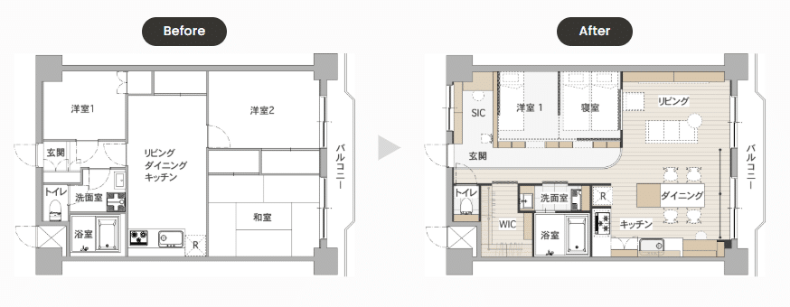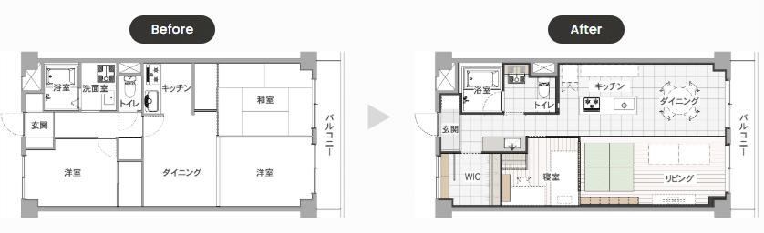 2つの洋室と間に挟まれた和室の壁をすべて取り払い、まるで大空間ワンルームのように仕上げた事例です。