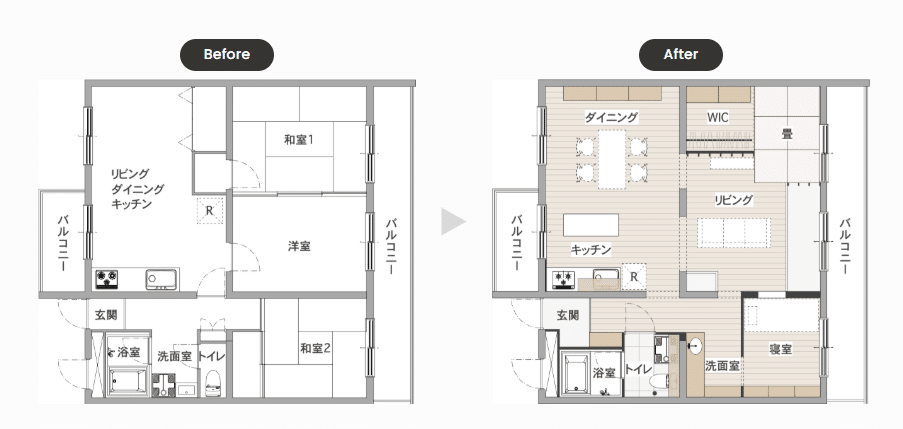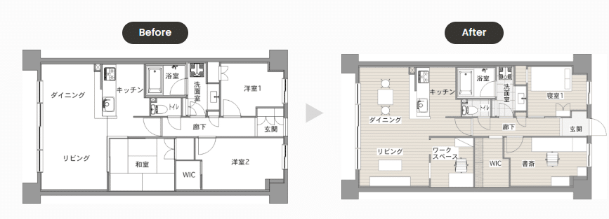 リノベーションによっては元の間取りをすべて変えて理想の間取りを叶えたり、壁や床も塗り替え・張り替えを行って空間のイメージを一新したりと希望を最大限に叶えることができます。