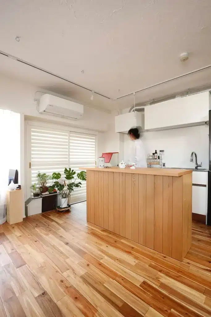 長く住めるように可変性を残しながら、63㎡をゆるやかに区切ってほぼワンルームに。バルコニーからの自然光が玄関にまで届く明るい空間です。キッチンは壁付けのL字型でLDKを広々と。ワークスペースは夫婦それぞれに、土間玄関とキッチン横に設けました。