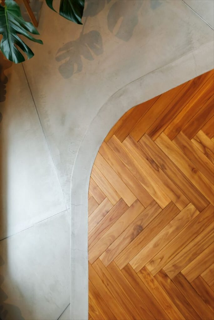こちらはフローリングの床と無機質な土間が柔らかさとクールさの正反対の味わいを醸し出してくれるデザインの事例です。