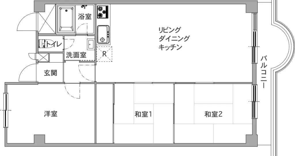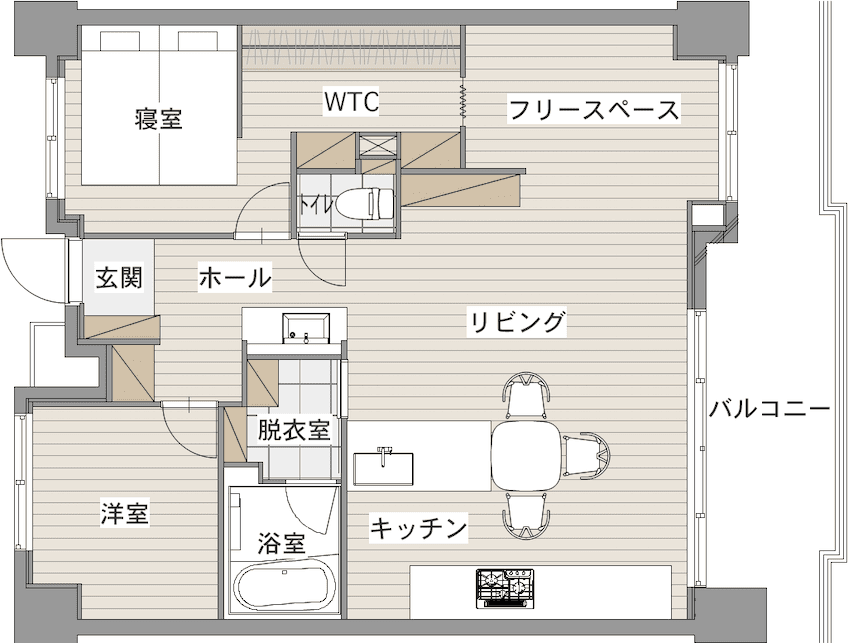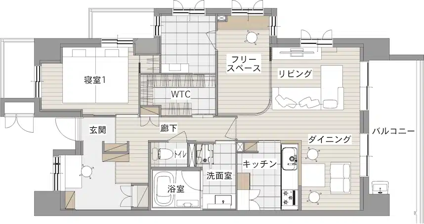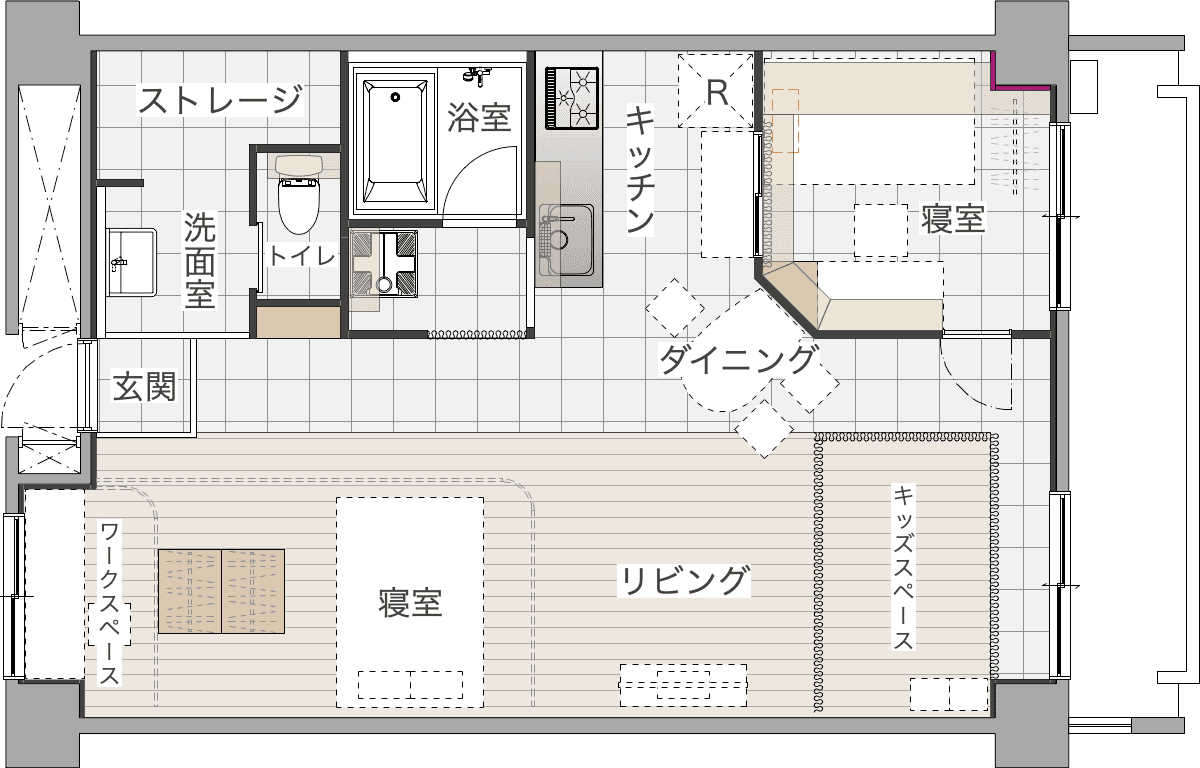 つづいて、元々ある壁を取り払った開放的な間取りでありながらも、家具やカーテンなどのレイアウト次第で自由な空間を楽しめる『可変性』がポイントの間取りを見ていきましょう。