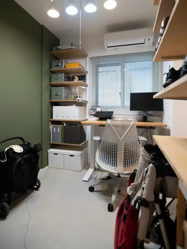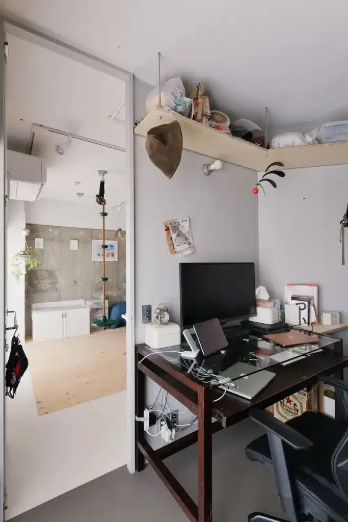 家族が一緒に過ごすLDKは、家具やカーテンのレイアウト次第で自由に変えられる空間に。ご主人様の個室にはPCとベッドを置いて、お仕事やプライベートとのメリハリをつけていますね。