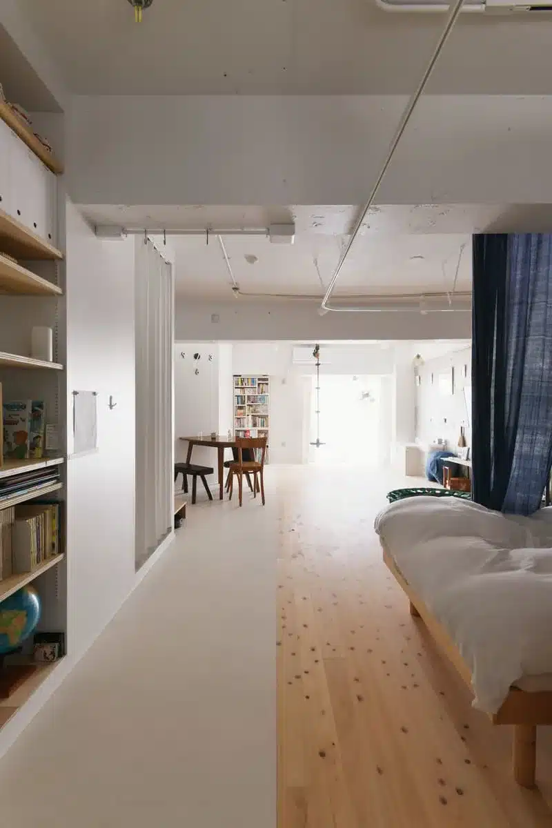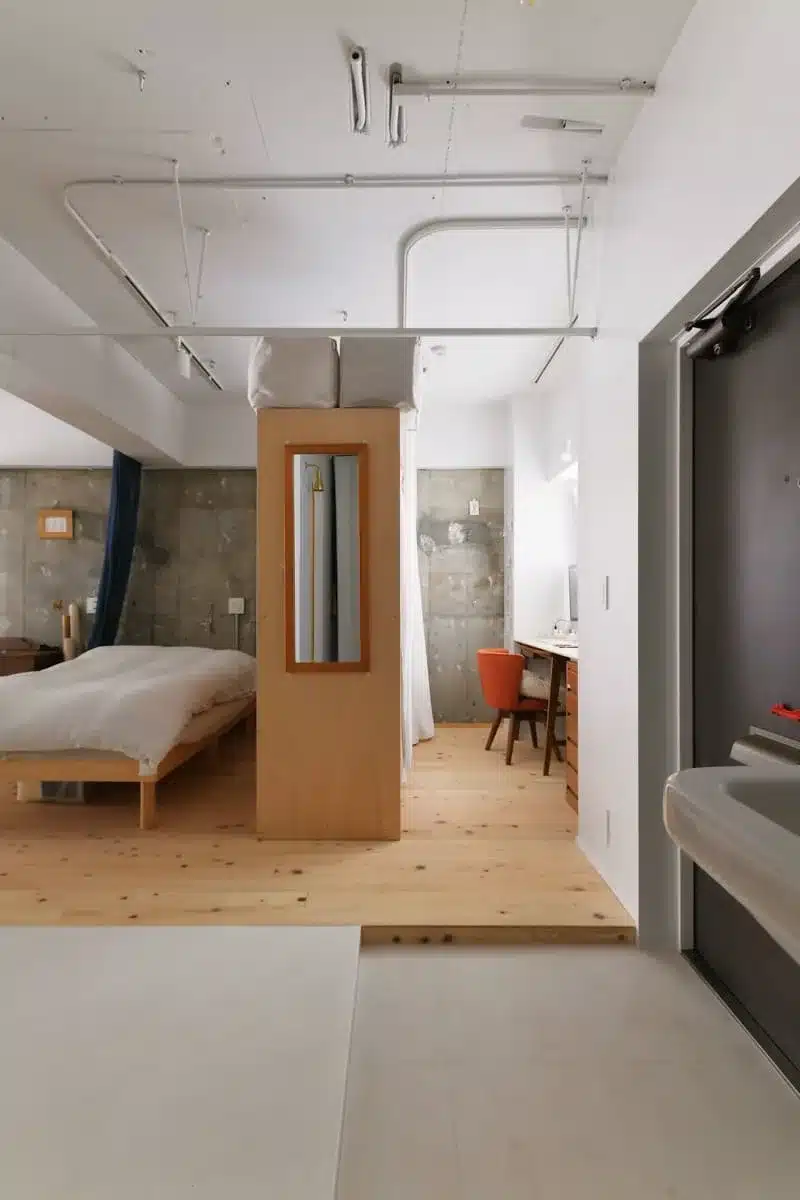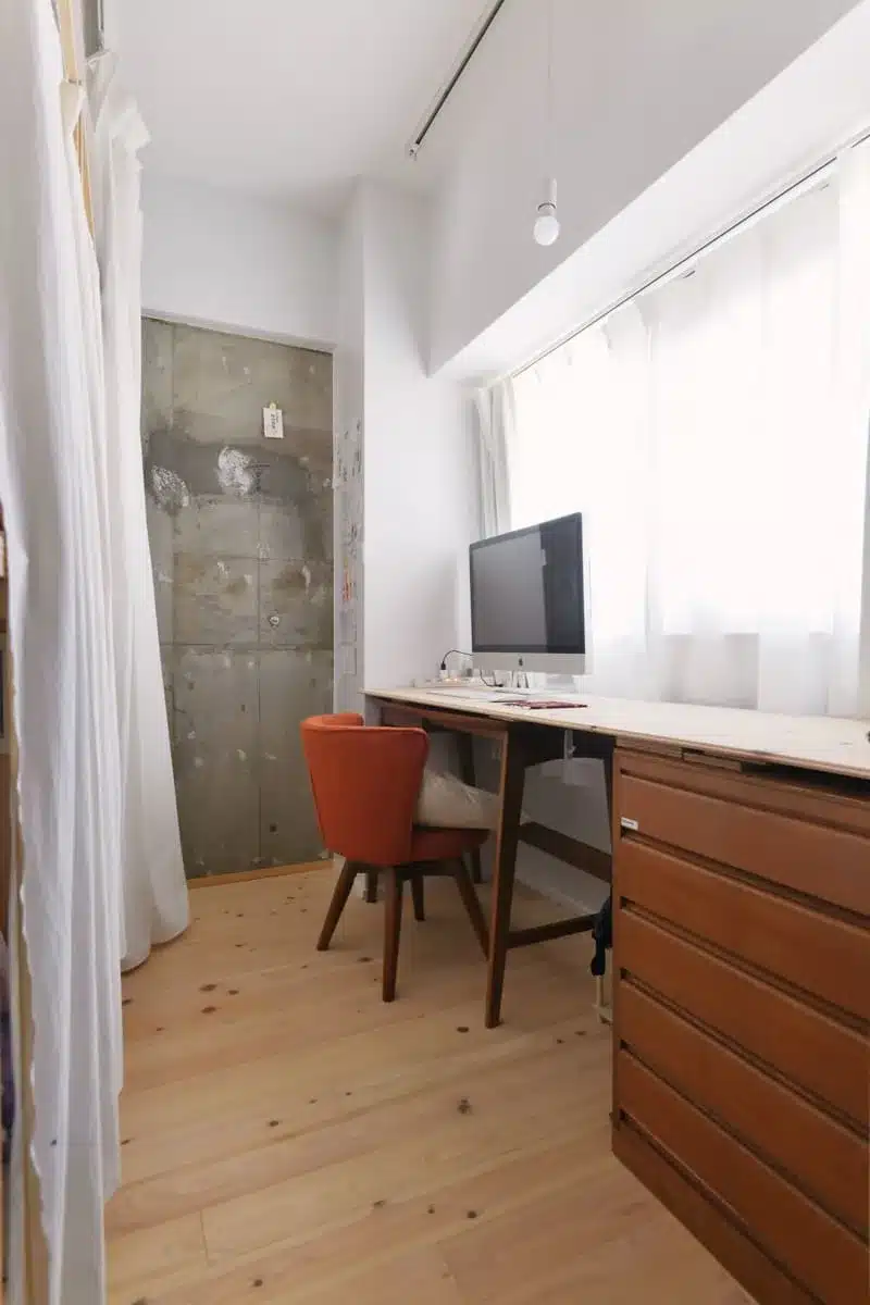 谷川ウォークスルークローゼットを間に挟むことで、寝室とフリースペース(将来のための余白)に丁度いい距離感を設けています。寝室や書斎の壁を躯体現しにしており、リノベならではの良さを感じ取れますね。